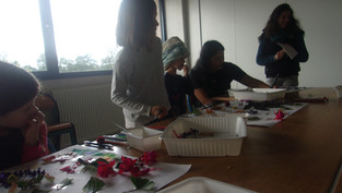 Récolte d'éléments de la nature des alentours, en priorité les feuilles et fleurs fanés, pour une sensibilisation au monde du vivant.